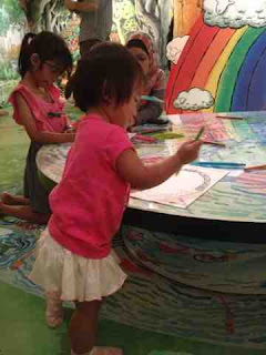 There was table where kids could do some coloring. It was only later that I found out they could actually flash your coring/drawing on a screen (think "Mirror mirror on the wall", and it was quite cool. P did her coloring with the kids, but her work was truly not impressive enough to flash on the screen, so I just quietly kept it for my own appreciation, haha.